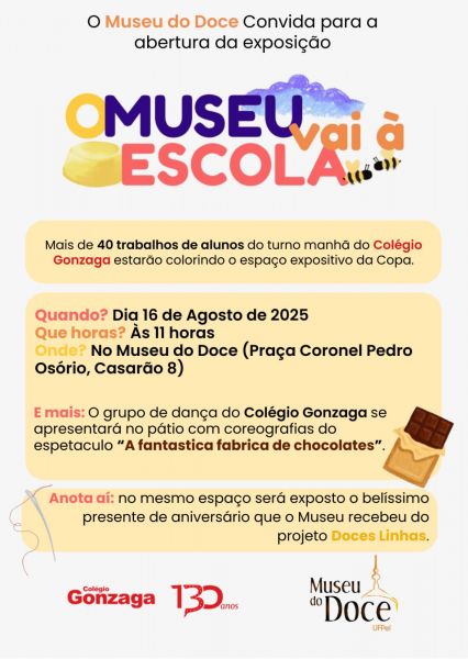 No sábado, 16 de agosto de 2025, às 11 horas, durante as comemorações do Dia do Patrimônio, o Museu do Doce abrirá, no espaço expositivo conhecido como Copa, a exposição “O museu vai à escola”.