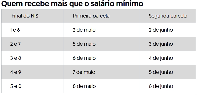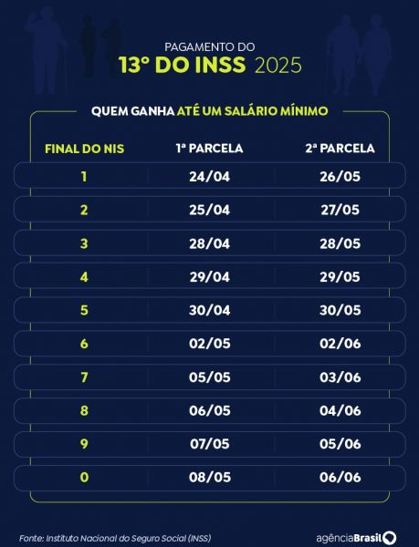 Com previsão de injetar R$ 73,3 bilhões na economia, a antecipação do décimo terceiro do INSS será paga em duas parcelas. A segunda parcela vai de 26 de maio a 6 de junho. As datas são definidas com base no dígito final do Número de Inscrição Social (NIS) e com base na renda do beneficiário. Quem ganha apenas o salário mínimo começa a receber antes de quem recebe mais que o mínimo.