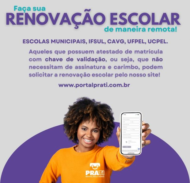 Para gozar do benefício da tarifa do transporte coletivo com 50% de desconto, é necessário que alunos de todas as redes e níveis de ensino renovem o Cartão Estudante. Para facilitar o processo e evitar filas, a Prefeitura, por intermédio da Secretaria de Transporte e Trânsito (STT) e do Consórcio do Transporte Coletivo de Pelotas (CTCP), recomenda a utilização do meio virtual portalprati,com,br/pelotas/renovacao-escolar, para quem possuir a chave de validação.