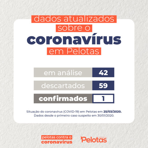 O primeiro caso do novo coronavírus foi registrado, nesta quarta-feira (25), em Pelotas. A confirmação do Laboratório Central do Estado (Lacen/RS) – único do Rio Grande do Sul credenciado para realizar os exames – foi anunciada pela prefeita Paula Mascarenhas, em coletiva de imprensa online. Trata-se de uma mulher, de 71 anos, que se encontra em isolamento domiciliar, com bom estado de saúde, sem apresentar sintomas graves da [...]