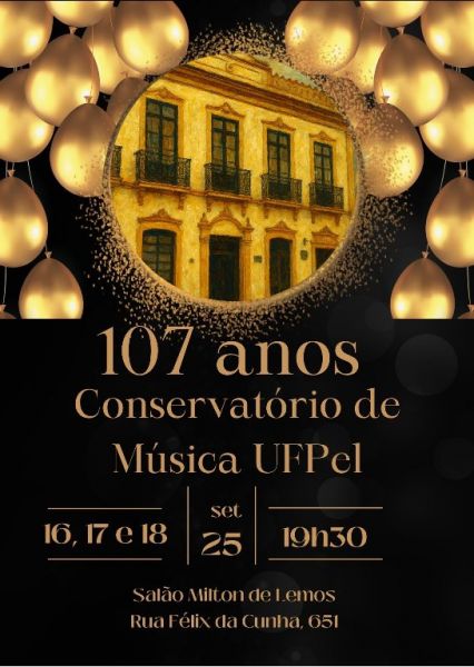 Em comemoração dos 107 anos do Conservatório de Música da Universidade Federal de Pelotas (UFPel), uma série de recitais, abertos ao público, será realizada de 16 a 18 de setembro, no Salão Milton de Lemos (rua Félix da Cunha, 651), sempre às 19h30. Estudantes, docentes e artistas convidadas e convidados apresentarão repertórios diversificados: da música erudita aos estilos contemporâneos.