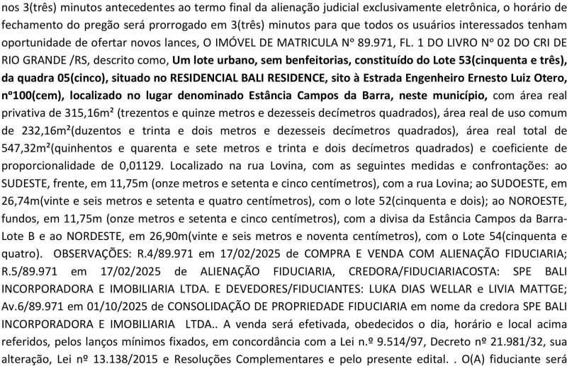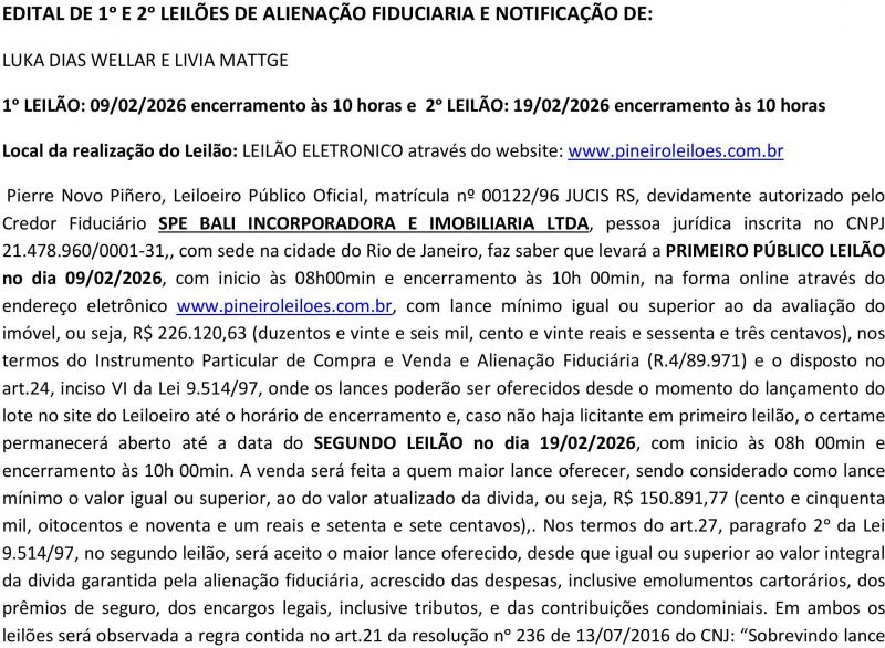 Edital de 1ᵒ e 2ᵒ Leilões de Alienação Fiduciária e Notificação de Luka Dias Wellar e Livia Mattge