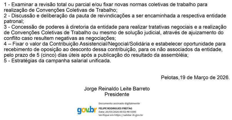 Edital de Convocação do Sindicato dos Trabalhadores das Indústrias Metalúrgicas, Mecânicas e de Material Elétrico de Pelotas
