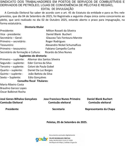 Edital de Divulgação do Sindicato dos Trabalhadores em Postos de Serviços de Combustíveis e Derivados de Petróleo, Lojas de Conveniência de Pelotas e Região