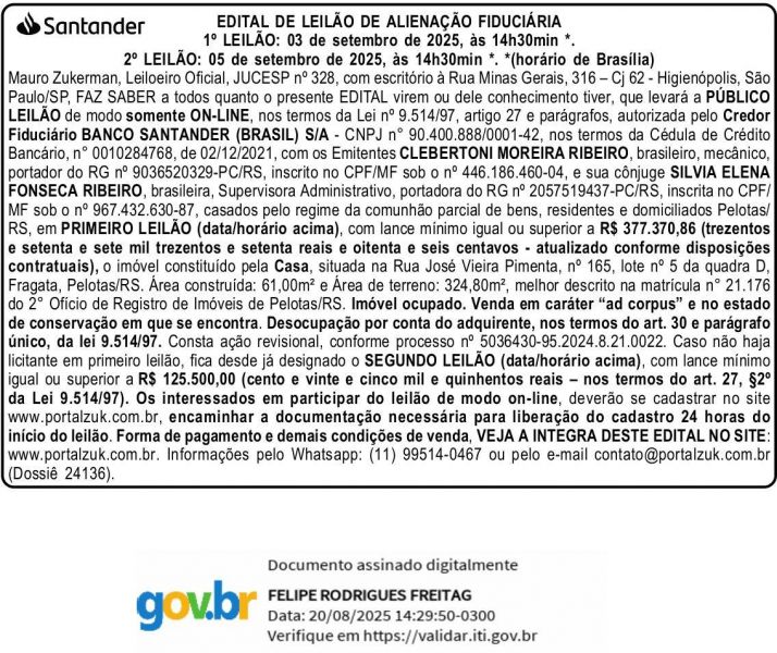 Edital de Leilão de Alienação Fiduciária Banco Santander (Brasil) S/A X Clebertoni Moreira Ribeiro
