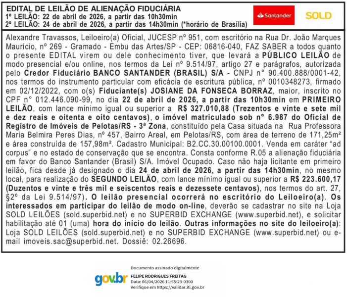 Edital de Leilão de Alienação Fiduciária Banco Santander (Brasil) S/A X Josiane da Fonseca Borraz