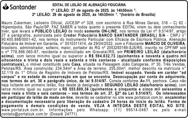 Edital de Leilão de Alienação Fiduciária Banco Santander (Brasil) S/A X Márcio de Oliveira