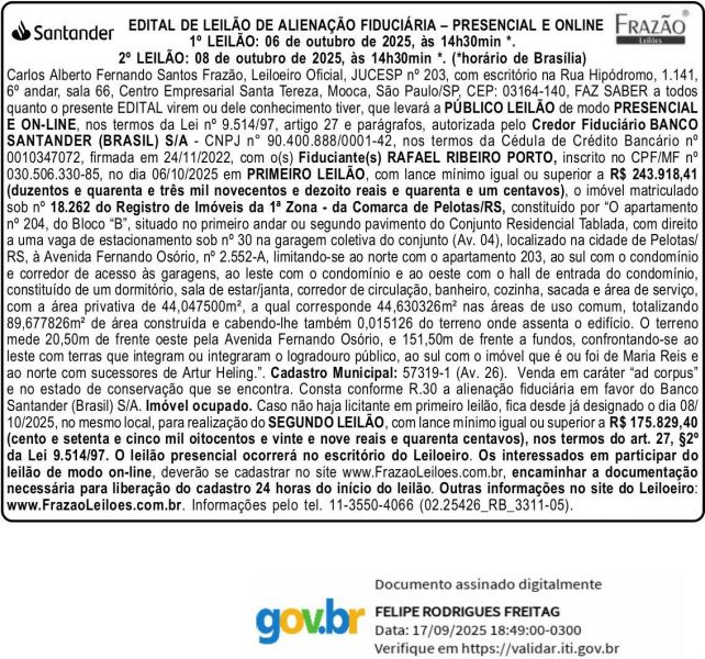Edital de Leilão de Alienação Fiduciária Banco Santander (Brasil) S/A X Rafael Ribeiro Porto