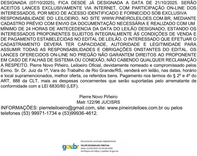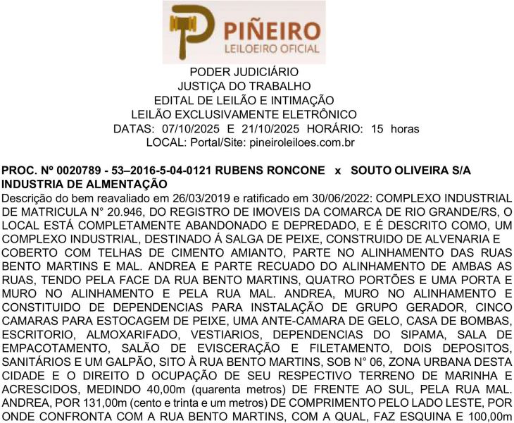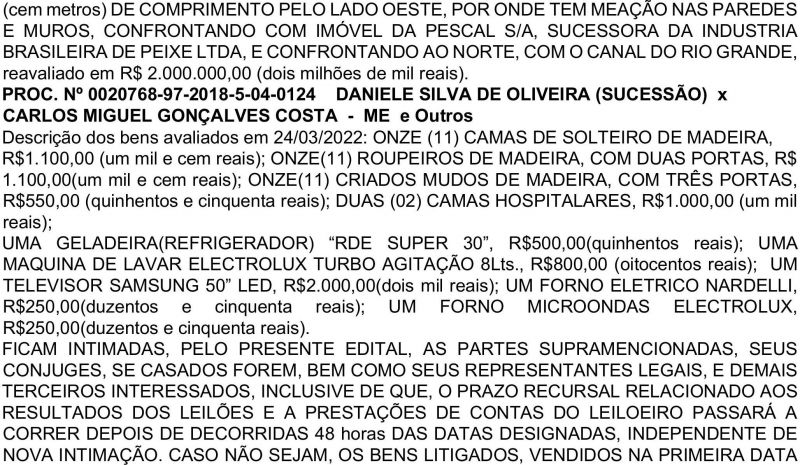Edital de Leilão e Intimação 1ª Vara do Trabalho de Rio Grande
