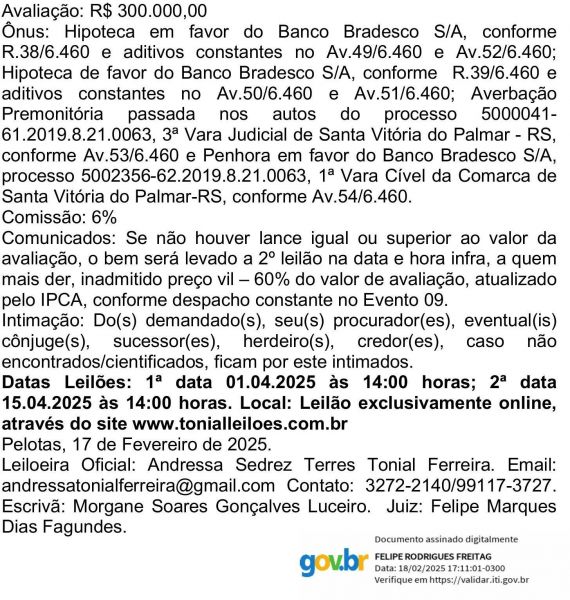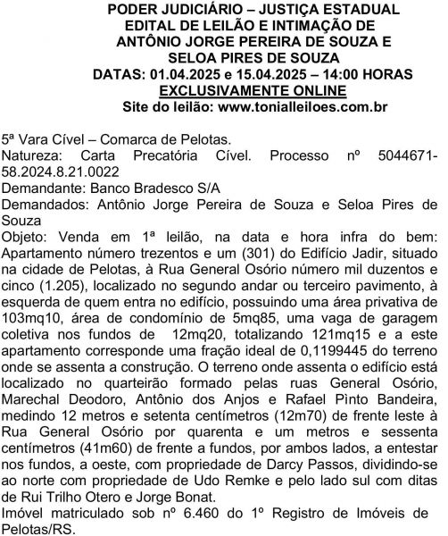 Edital de Leilão e Intimação de Antônio Jorge Pereira de Souza e outra