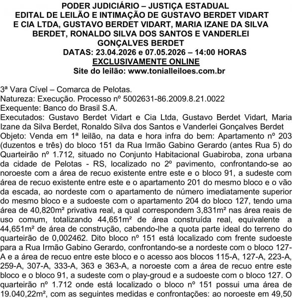 Edital de Leilão e Intimação de Gustavo Berdet Vidart e Cia. Ltda. e outros