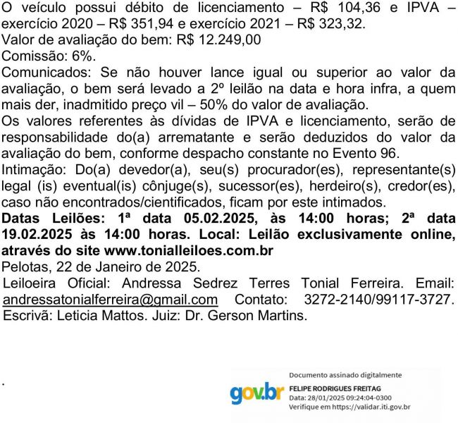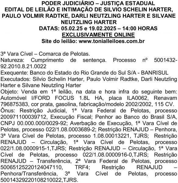 Edital de Leilão e Intimação de Silvio Schelin Harter, Silvane Neutzling Harter e outros