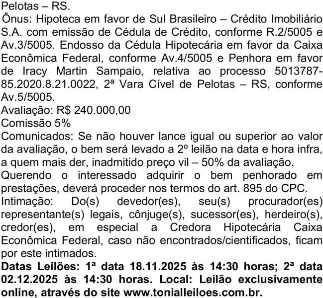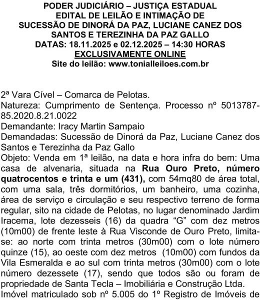 Edital de Leilão e Intimação de Sucessão de Dinorá da Paz, Luciane Canez dos Santos e Terezinha da Paz Gallo