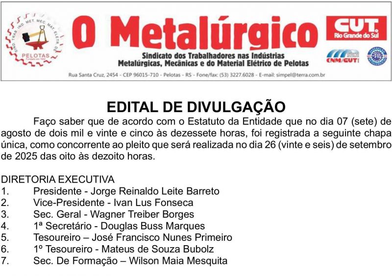 Edital do Sindicato dos Trabalhadores nas Indústrias Metalúrgicas, Mecânicas e do Material Elétrico de Pelotas