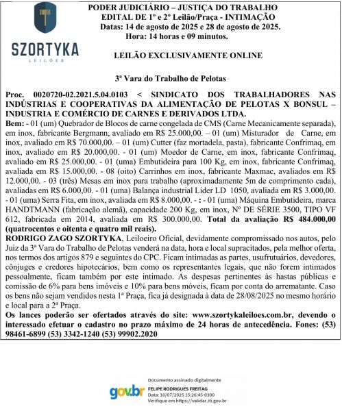 Edital Szortyka Leilão e Intimação 3ª Vara do Trabalho de Pelotas