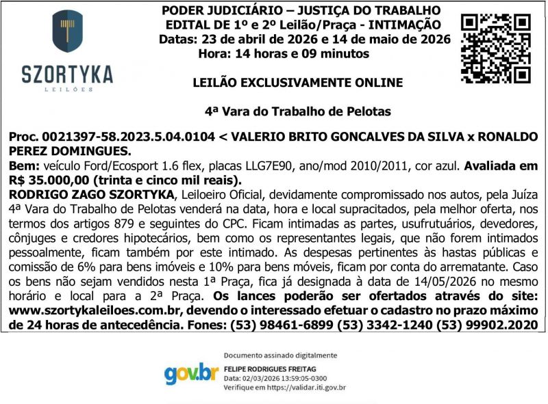 Edital Szortyka Leilão e Intimação 4ª Vara do Trabalho de Pelotas