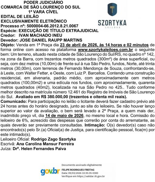 Edital Szortyka Leilão e Intimação de José Daniel Raupp Martins