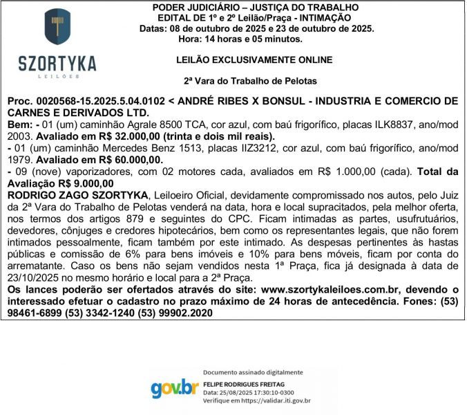 Edital Szortyka Leilão Praça e Intimação 2ª Vara do Trabalho de Pelotas