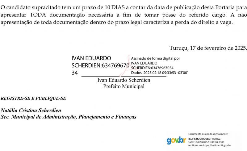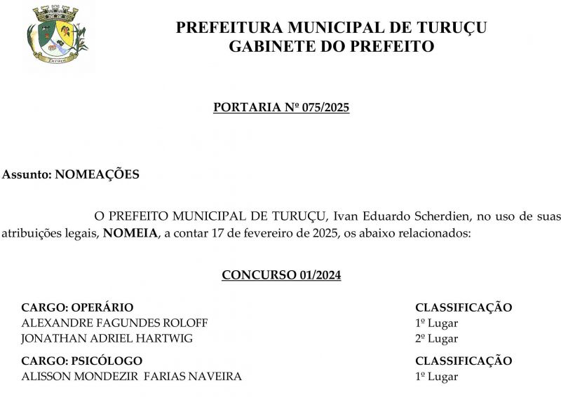 Edital Turuçu Portaria 075/2025 – Nomeações