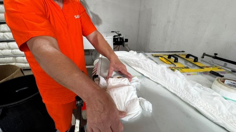 Instalada em sala com mais de 20 metros quadrados, a linha de produção conta com tecnologia de ponta, incluindo sistema automatizado de recorte, dobra e aplicação de adesivos, conferindo maior eficiência e padronização ao processo de confecção.