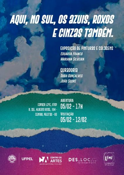 Nesta quinta-feira (05) às 17h inicia a exposição “Aqui, no Sul, os azuis, roxos e cinzas também”, das artistas Eduarda Franco e Mariana Silveira. Ambas são estudantes do curso de Bacharelado em Artes Visuais, do Centro de Artes da Universidade Federal de Pelotas (UFPel). Os trabalhos, que envolvem técnicas de pintura e colagem, podem ser apreciados no Espaço Leme, que fica no prédio do Instituto de Filosofia, Sociologia e Política (IFISP/UFPel), na rua Coronel Alberto Rosa, 154. O período de visitação vai até 12 de fevereiro.
