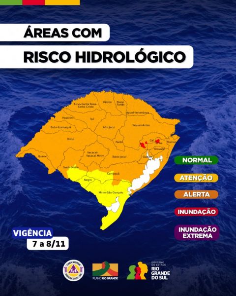 Em função das chuvas intensas previstas, com precipitações moderadas a altas em um curto período de tempo, é indicada a condição de Atenção e Alerta para os municípios em amarelo e laranja no mapa hidrológico, respectivamente. Destaca-se a elevação rápida com alto risco de cheias em arroios e pequenos rios, assim como enxurradas em regiões de maior declividade. Além disso, podem ocorrer fortes alagamentos em perímetros urbanos conforme a intensidade das chuvas.
