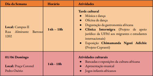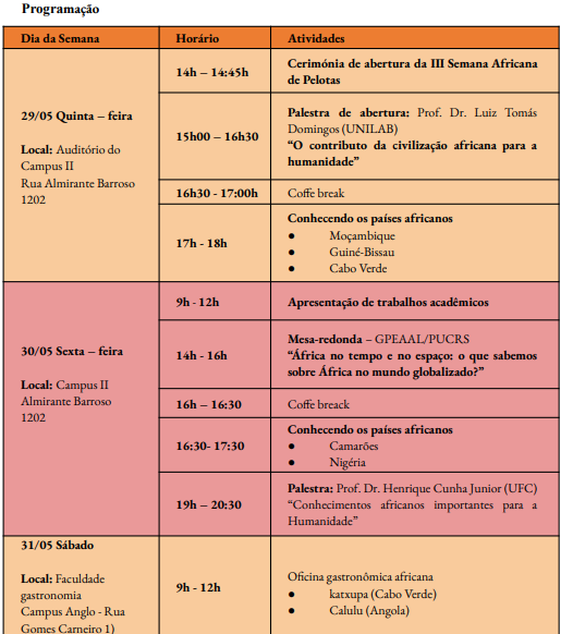 A maior parte da programação vai acontecer no câmpus II da Universidade Federal de Pelotas (UFPel), à rua Almirante Barroso, 1.202 – Centro, mas no domingo (1°/6) haverá um grande evento na Praça Coronel Pedro Osório, a partir das 14h, com show musical, exposições dos 15 países africanos participantes, jogos infantis africanos e interações com o público.