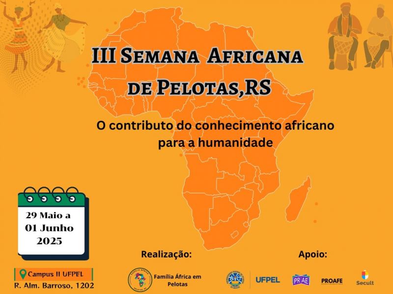 A Prefeitura de Pelotas, por meio das secretarias de Cultura (Secult) e de Turismo (Setur), é apoiadora institucional da III Semana Africana de Pelotas/RS, que nesta edição tem o slogan “O contributo do conhecimento africano para a humanidade” e apresentará aspectos culturais de oito países da África. O evento acadêmico, cultural e esportivo é organizado por cerca de 18 estudantes africanos residentes em Pelotas – oriundos de Cabo Verde, Moçambique, Angola, Nigéria, Senegal, Camarões, São Tomé e Príncipe e Guiné Bissau -, que integram o grupo Família África em Pelotas, com o apoio da Universidade Federal de Pelotas (UFPel). A III Semana Africana começa na quinta-feira 29 de maio e se estende até 1º de junho, e terá palestras, mesas-redondas, atividades gastronômicas africanas, exposições de projetos, cultura e saberes ancestrais, além de promover a troca de experiências entre acadêmicos e a comunidade local.