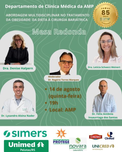 Com o título: “Abordagem multidisciplinar no tratamento da Obesidade: Da dieta à cirurgia bariátrica”. O evento que é gratuito é destinado aos médicos e residentes da região, para participar é necessário entrar em contato com a sede da AMP, pelo telefone 53-32226309, para confirmar a inscrição.