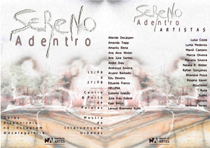 Uma série de intervenções urbanas realizadas por estudantes do sétimo semestre do curso de Artes Visuais da Universidade Federal de Pelotas (UFPel) está sendo apresentada na mostra “Sereno Adentro”. Os trabalhos podem ser vistos no perfil da Galeria A Sala no Instagram (@asalagaleria) até o dia 27 de agosto.