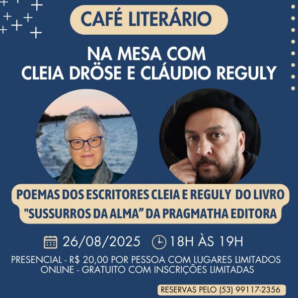 Nesta edição, serão discutidos os poemas dos escritores Cláudio Reguly e Cleia Dröse que estão no livro “Sussurros da Alma”, uma antologia poética organizada pela Pragmatha Editora com a participação de 10 escritores. O livro digital será fornecido gratuitamente após a inscrição.