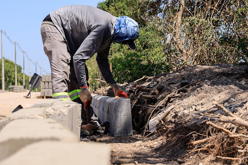 Na região do São Gonçalo, a Estrada do Engenho recebe obras de meios-fios e sarjetas de drenagem, além de ajustes finais na pavimentação para ingresso na etapa de sinalização viária.