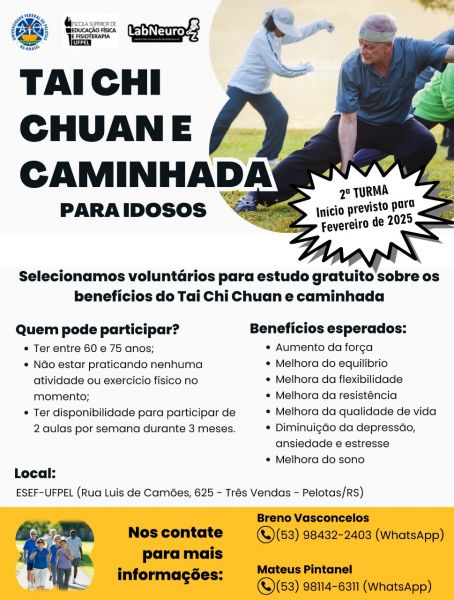 Uma pesquisa inovadora, conduzida no Laboratório de Avaliação Neuromuscular (LabNeuro) da Escola Superior de Educação Física da Universidade Federal de Pelotas (ESEF-UFPel), está investigando os benefícios do Tai Chi Chuan e da caminhada na saúde física e mental de idosos sedentários. Após três meses de atividades, a primeira turma de participantes concluiu a pesquisa com resultados positivos, reforçando a eficácia dessas práticas para melhorar indicadores de saúde na terceira idade.