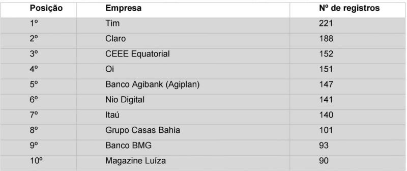 Além das provedoras dos serviços de telefonia e internet, entre as quais também está a Nio Digital na sexta posição, destacam-se bancos e financeiras. Agibank (Agiplan) recebeu 147 reclamações, seguido pelo Itaú, com 140 demandas, e BMG, responsável por 93 ocorrências formalizadas no órgão.