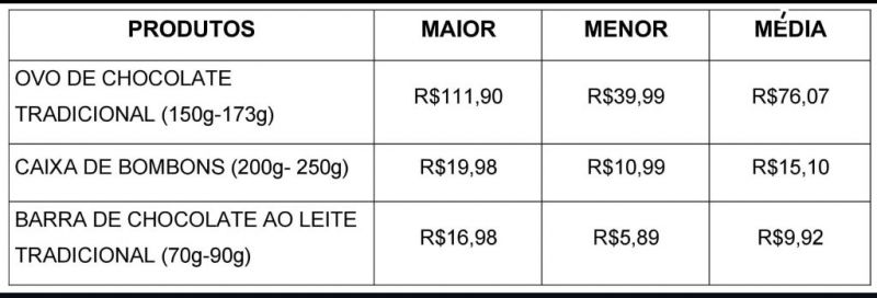 A 13 dias do domingo de Páscoa, 5 de abril, servidores do Procon Pelotas procederam ao levantamento dos preços mais altos, mínimos e médios dos produtos de chocolate, em macro e supermercados da cidade. Ao pesquisar as médias dos valores e confrontá-las com as de 2025, a equipe encontrou as variações, para mais, de 1,13% do ovo – com pesos entre 150 e 173 gramas – e de 8,07% da barra, ambos “ao leite tradicional”.