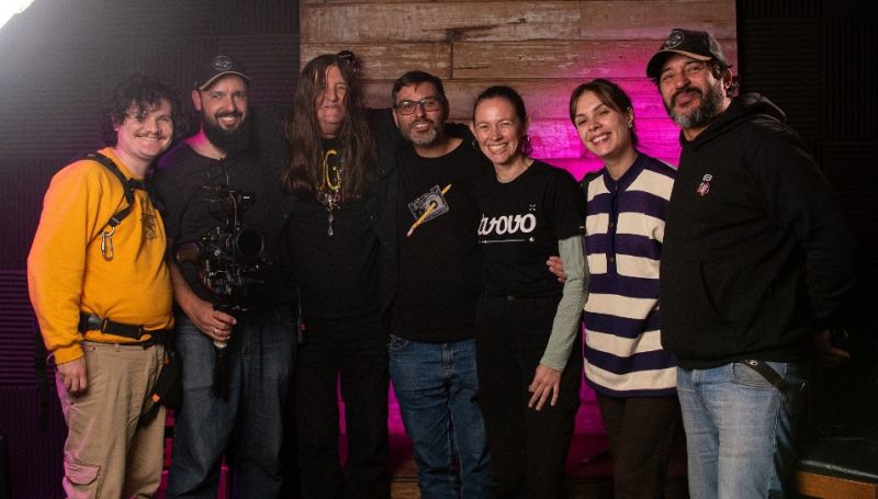 Vocalista Pylla (Fuga) ao lado dos diretores Marcos Borba e Neli Mombeli (casal à direita do músico) com parte da equipe do Rock do K7 – Foto: João Pedro Ribas