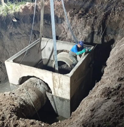 A caixa separadora é executada com aduelas de concreto, de dimensões 2,5 x 2,5 metros. O serviço teve início na última quarta-feira (5) e será concluído ainda nesta semana. Na operação, são utilizados caminhão munck, caçamba, guindaste e escavadeira.