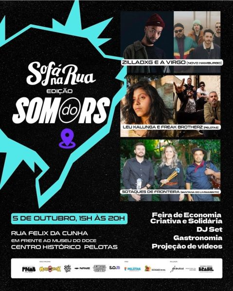 Em outubro, a rua de Pelotas será palco para uma das apresentações do Som do RS. Com bandas selecionadas pela curadoria, elas irão se apresentar em três municípios do Rio Grande do Sul a partir de outubro. Em Pelotas, a parceria não poderia ser outra: O Sofá na Rua, está junto nesta produção, que contará com shows, economia criativa, performances, DJs, projeções de vídeos, exposições e gastronomia, em eventos abrangentes e inclusivos.