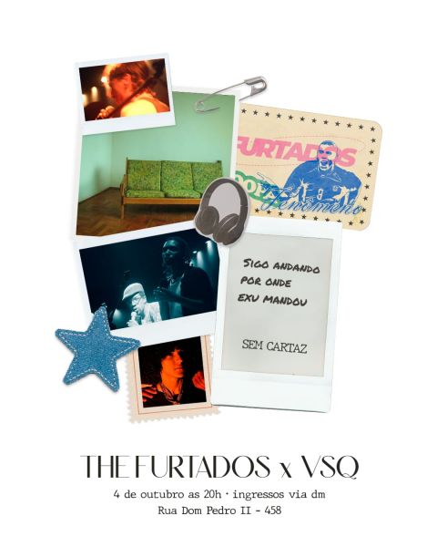 O grupo THE FURTADOS (@_furtados) estará no VSQ-Cia de Teatro nesse sábado (04/10) às 20h com uma performance no formato Tiny Desk passando pelo seu repertório já consolidado, além de novas músicas de seu EP homônimo lançado em julho, unindo rap, bossa e rock num formato intimista e experimental.