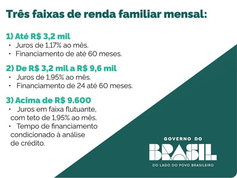 - Renda acima de R$ 9.600: faixa flutuante, condicionada à análise de crédito, mas o limite de juros é de 1,95%).